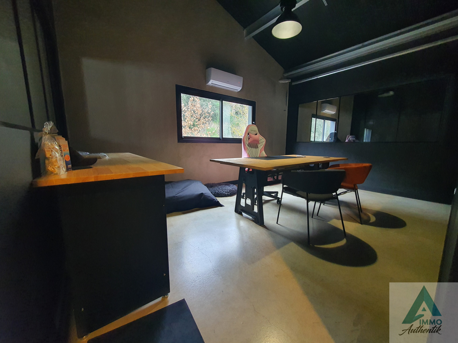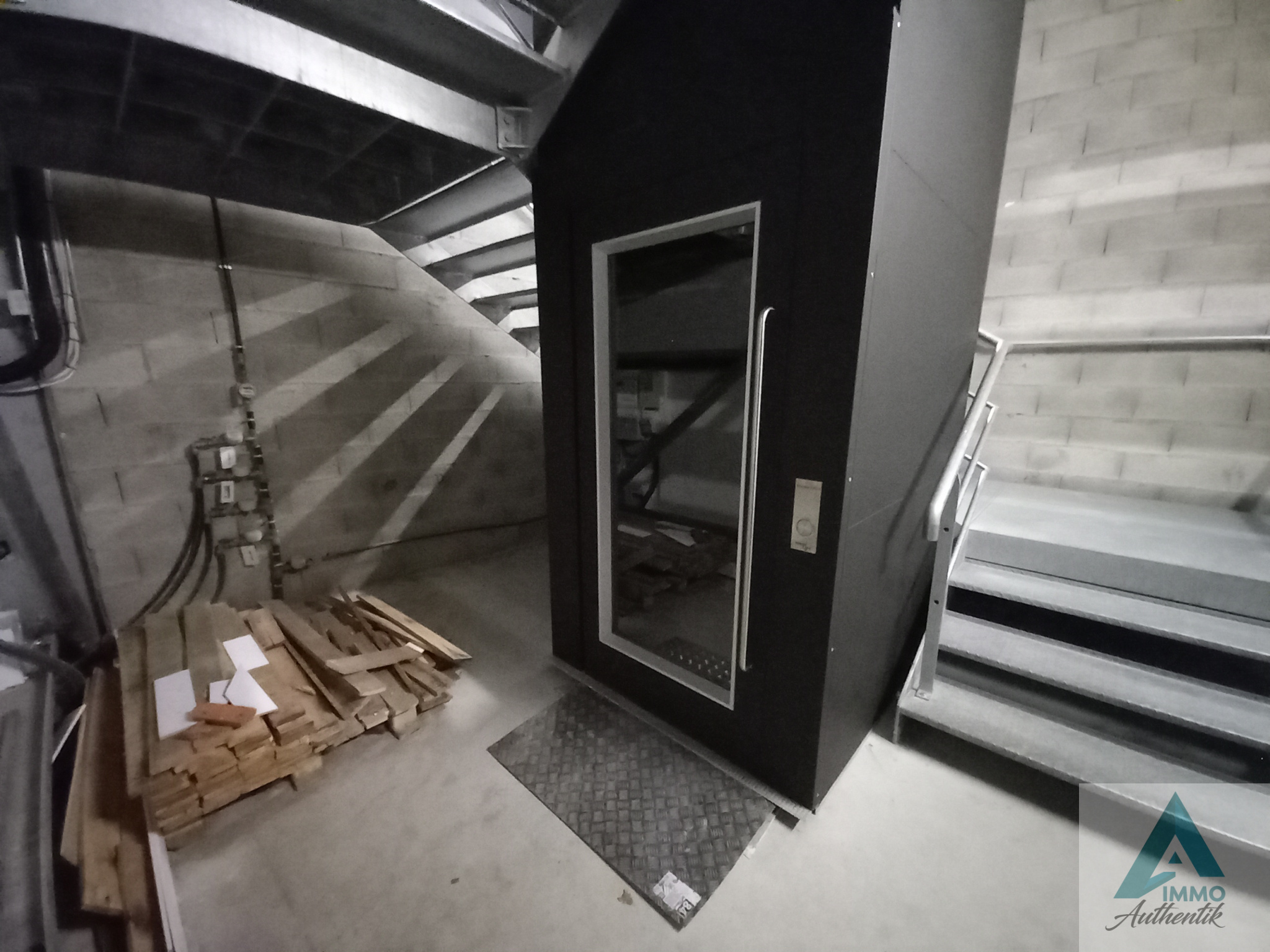 Equipé d’un monte-charge (normes handicapées) A l’étage on accède à un grand espace desservant un espace détente avec sanitaires, une surface stockage, trois bureaux, une salle de réunion et une pièce noire (anciennement destinée à un atelier photo).